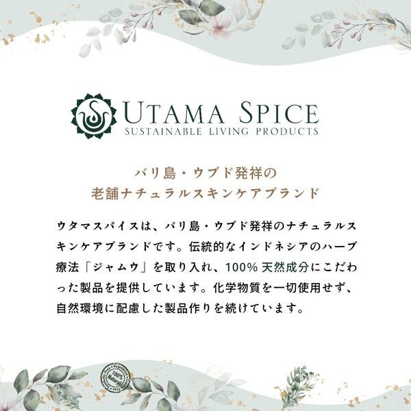 【ウタマスパイス】は、バリ島・ウブド発祥のナチュラルスキンケアブランドで、100%天然成分を使用しています。バリ島の高級ホテルや空港でも広く使用・販売されており、自然と調和した製品作りを行っています。